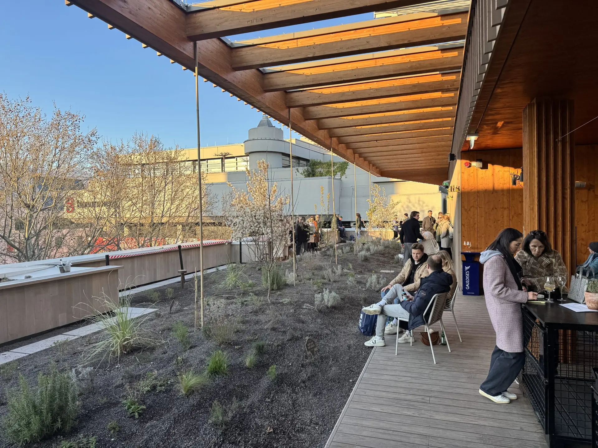 Gärtner haben auf der Dachterrasse Stuttgarts  Hügellandschaft nachempfunden. Kleine Erhebungen erinnern an die Kessel-Topografie. Ehrfürchtig läuft man drum herum. Nur bitte keinen Schritt hinein, auch nicht nach dem dritten Aperol.  Dazu scheint die Abendsonne erstaunlich lange, ehe sie fast schon theatralisch  hinterm Rathaus untergeht.