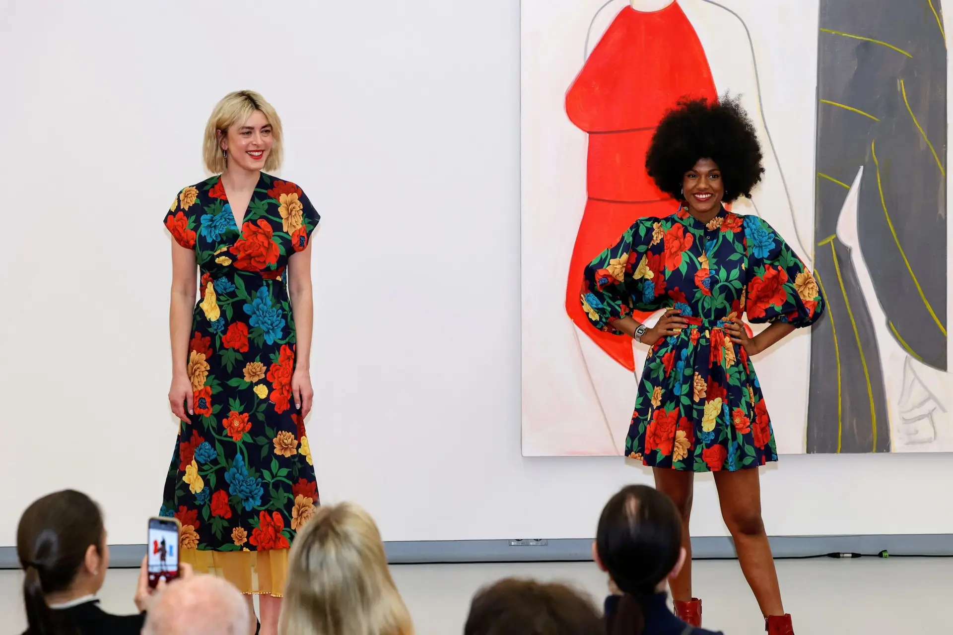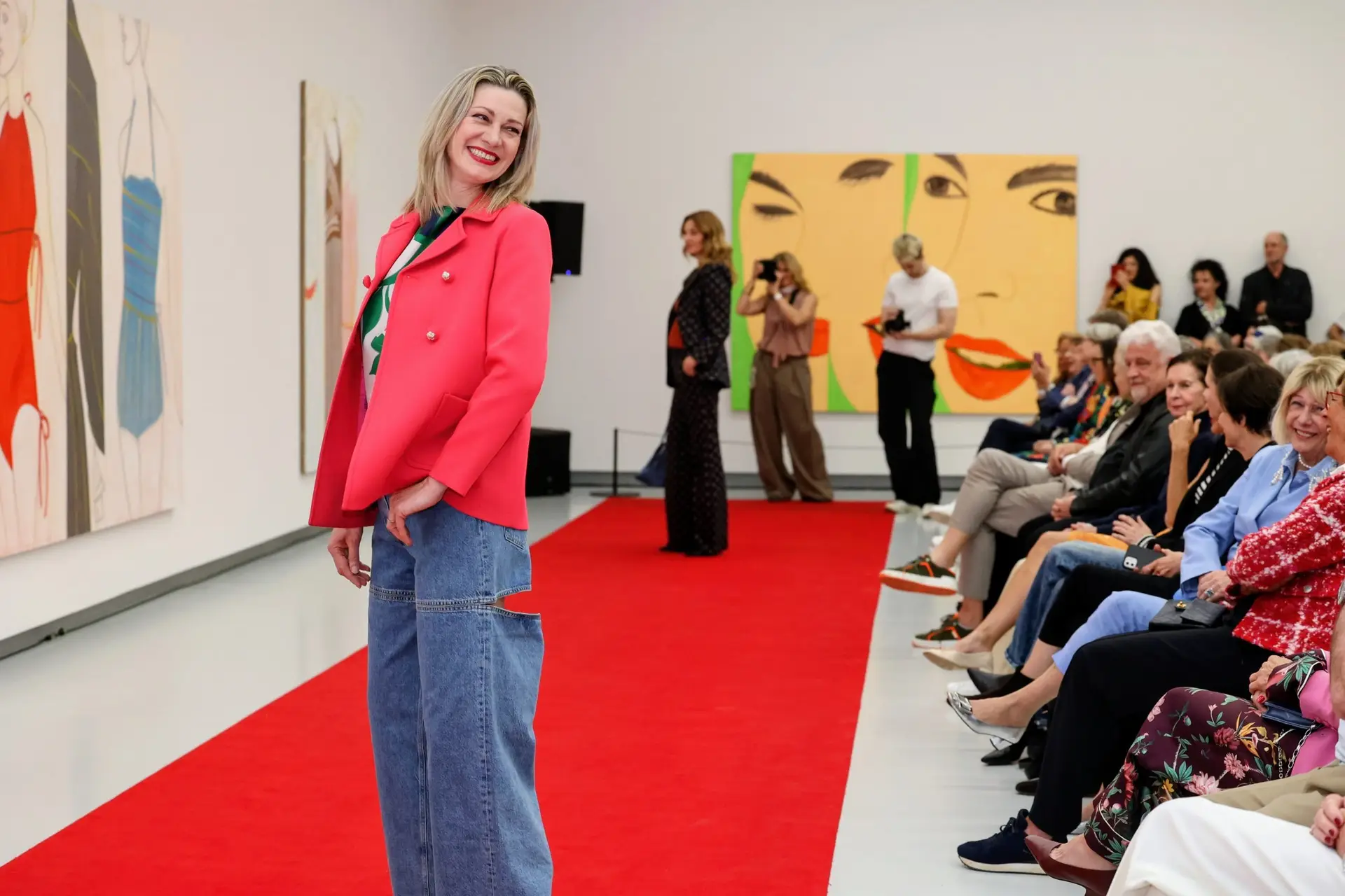 Zwischen den Werken entsteht ein Laufsteg. Models von Abseits bewegen sich durch die Ausstellung, als würde die Kunst selbst in Bewegung geraten. Olivgrün, florale Muster, markante Jeans, Sakkos und große Hüte prägen den Look – Mode, die mit der Bildsprache von Katz in einen stillen Dialog tritt.
